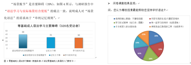 调研驱动,聚焦真实需求。为确保项目成果能够真正解决实际问题,学生利用暑假期间开展了面向英语语法学习者的问卷调查与数据分析。其中,某小组通过调研发现:“语法规则与生活场景脱节”是广大学习者的核心痛点,基于此发现,项目小组确立了“场景化语法”的核心设计理念,并在后续的教案撰写、脚本创作与课件开发中,始终围绕真实的生活情境来组织和呈现语法知识。这种以用户真实需求为导向的设计思路,确保了项目最终成果具备高度的针对性,能直击学习难点,有效提升学习者的知识应用能力与学习效率。
