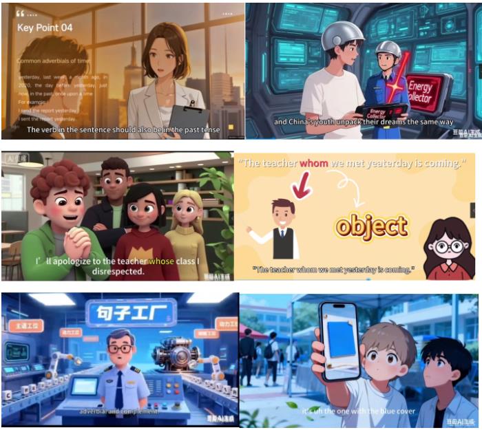 本次项目共产出177件高质量作品,涵盖教案、脚本、课件、PPT及虚拟主播教学视频等多种类型,形成了一个内容丰富、形式多样的智慧教学资源库。其中,学生们制作的微课视频逻辑清晰、发音标准、画面生动,将复杂语法知识阐述得深入浅出;精心设计的PPT与信息图表,则将抽象语法概念转化为直观的可视化表达。此外,项目过程中形成的生生互评表、个人反思日志、总结报告等材料,全面记录了学生在项目推进中的思维转化路径与成长轨迹。这些成果不仅展现了学生在教学设计、技术应用、创新实践与团队协作等方面的综合能力,也充分体现了项目在应用型人才培养方面的显著成效。